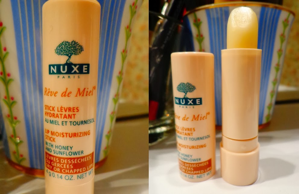 Après, vous rincez (ou léchez vos lèvres et appliquez un baume à lèvres. Pour rester dans le thème du miel, j’utilise NUXE – rêve de miel.