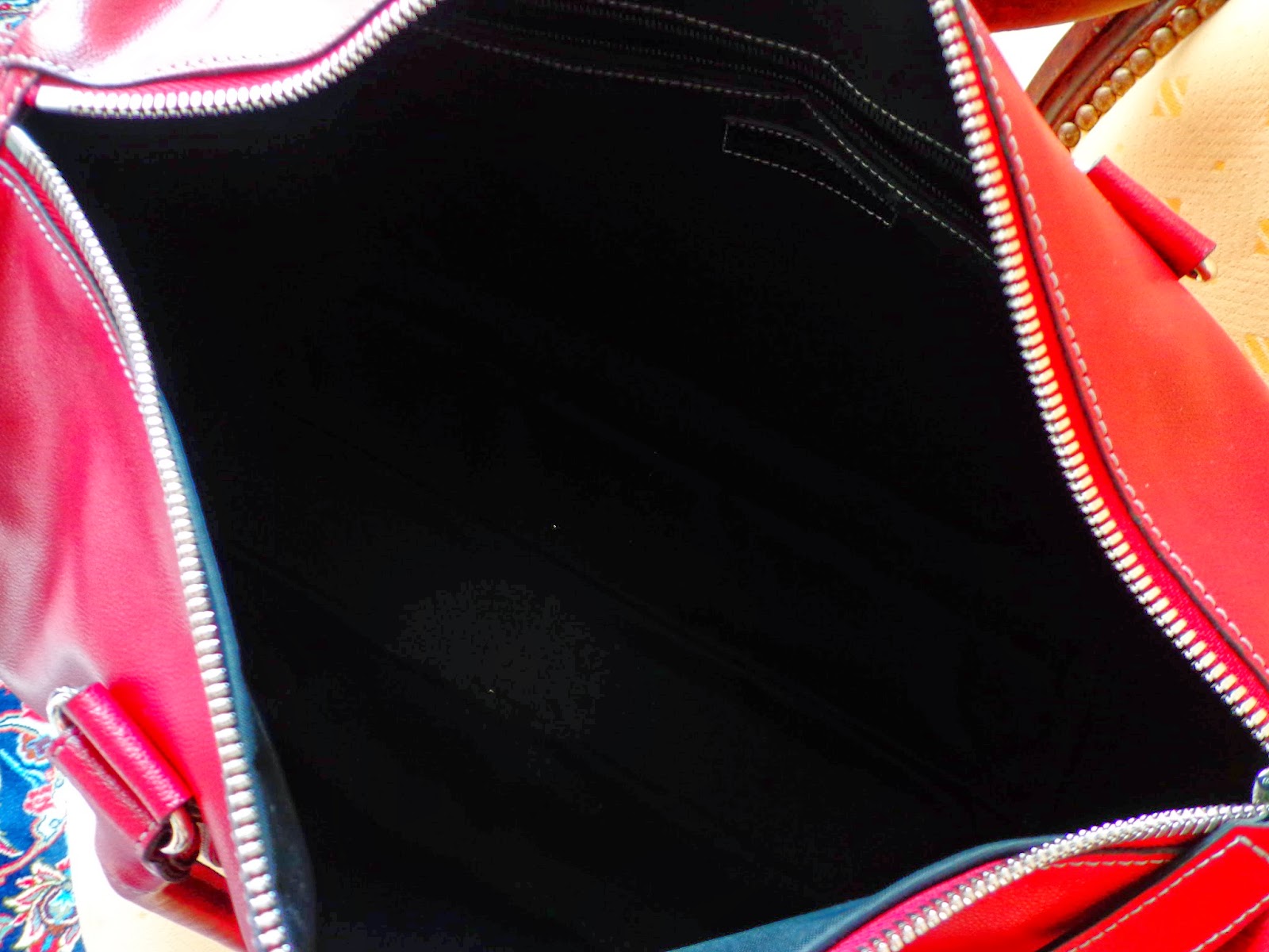 Ce sac est un porté épaule court mais j’ai davantage à le porter dans le creux du coude. La fermeture se fait également par zip. Il a une forme plus rectangulaire. Dimension : 39 x 27 x 13.