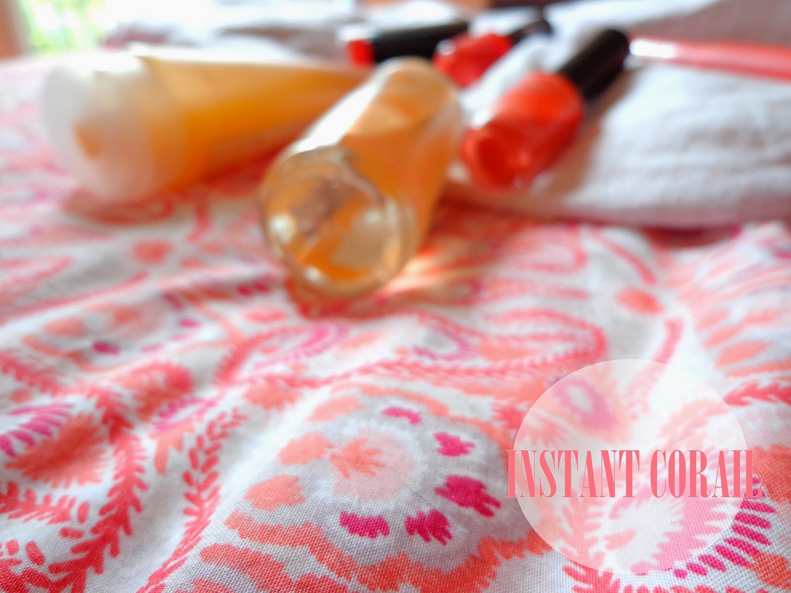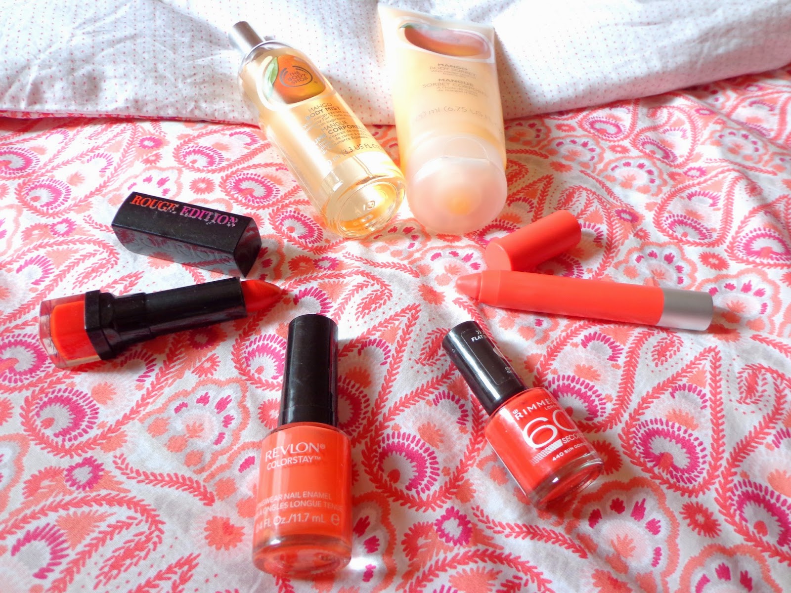Petite sélection de produits de beauté dans les tons d’orange et de corail.