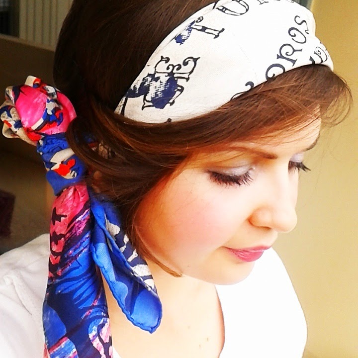 The scarf I’m wearing is a silk scarf by Christian Lacroix. This is the only square silk I have. I bought it in 2009 because I really wanted to have a pretty scarf tied in my hair for a wedding I attended. I had even shorter hair than today. I was inspired by a scene where the Gossip Girl character Serena Van Der Woodsen who wears a Chanel scarf in her hair at school.