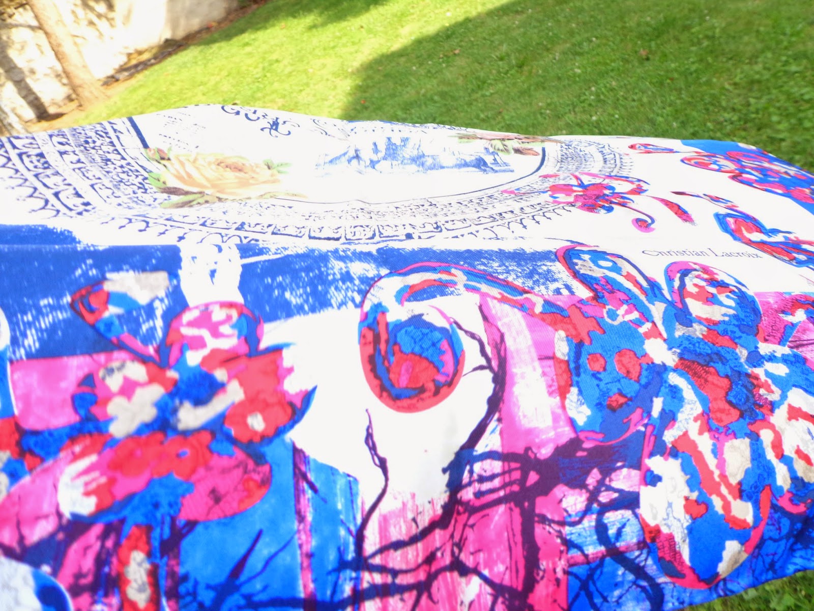 J’aime beaucoup les couleurs vives de ce foulard: le bleu et le fushia. Les dessins me font penser à un mélange entre Picasso et Dali : les taureaux, la manière dont sont dessinées et disposées les fleurs me rappellent un peu la période impressionniste.