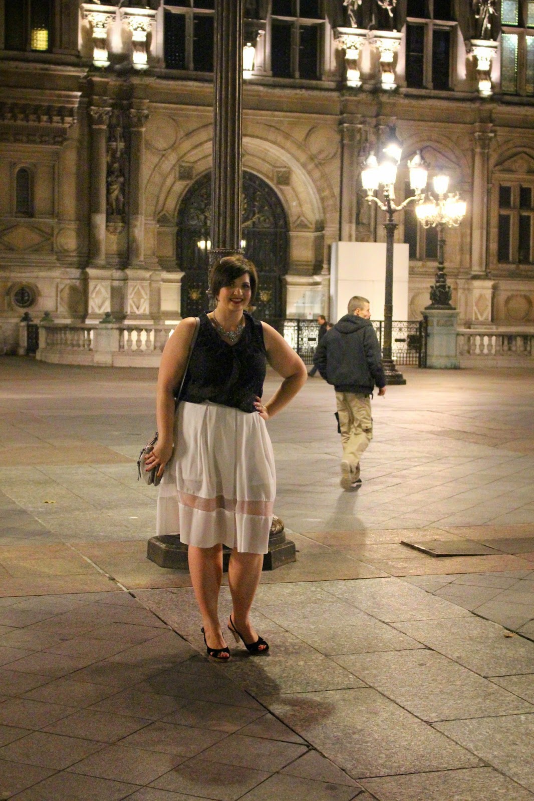 City of lights, Paris plays with shadows and shades of gray. My evening outfit does the same: white and black with a touch of silvery grey: Paris and I resonate together this evening. Suspended and spiked heels, Paris is a city you discovered like a secret – like the body revealed by the slightly ethereal fabrics.