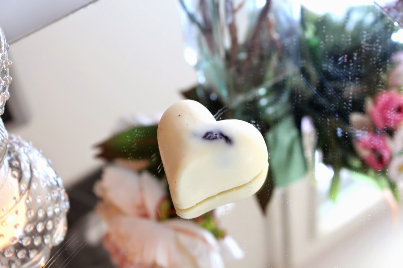 A small melting cocoa and honey massage heart. This will hydrate and add a sweet fragrance to your skin.