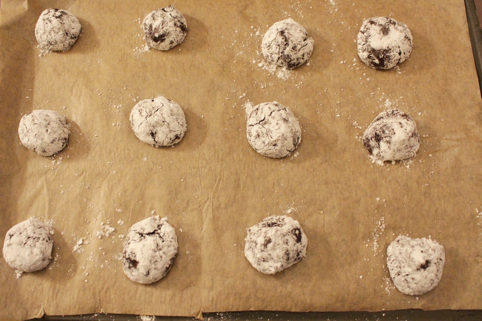 - Preheat oven to 180C./gas mark 4. Line baking trays with parchment. Pour icing sugar onto a plate and using a metal tablespoon, spoon and coat each one with the icing sugar while rolling into a 2,5cm balls before plasing onto prepared trays.