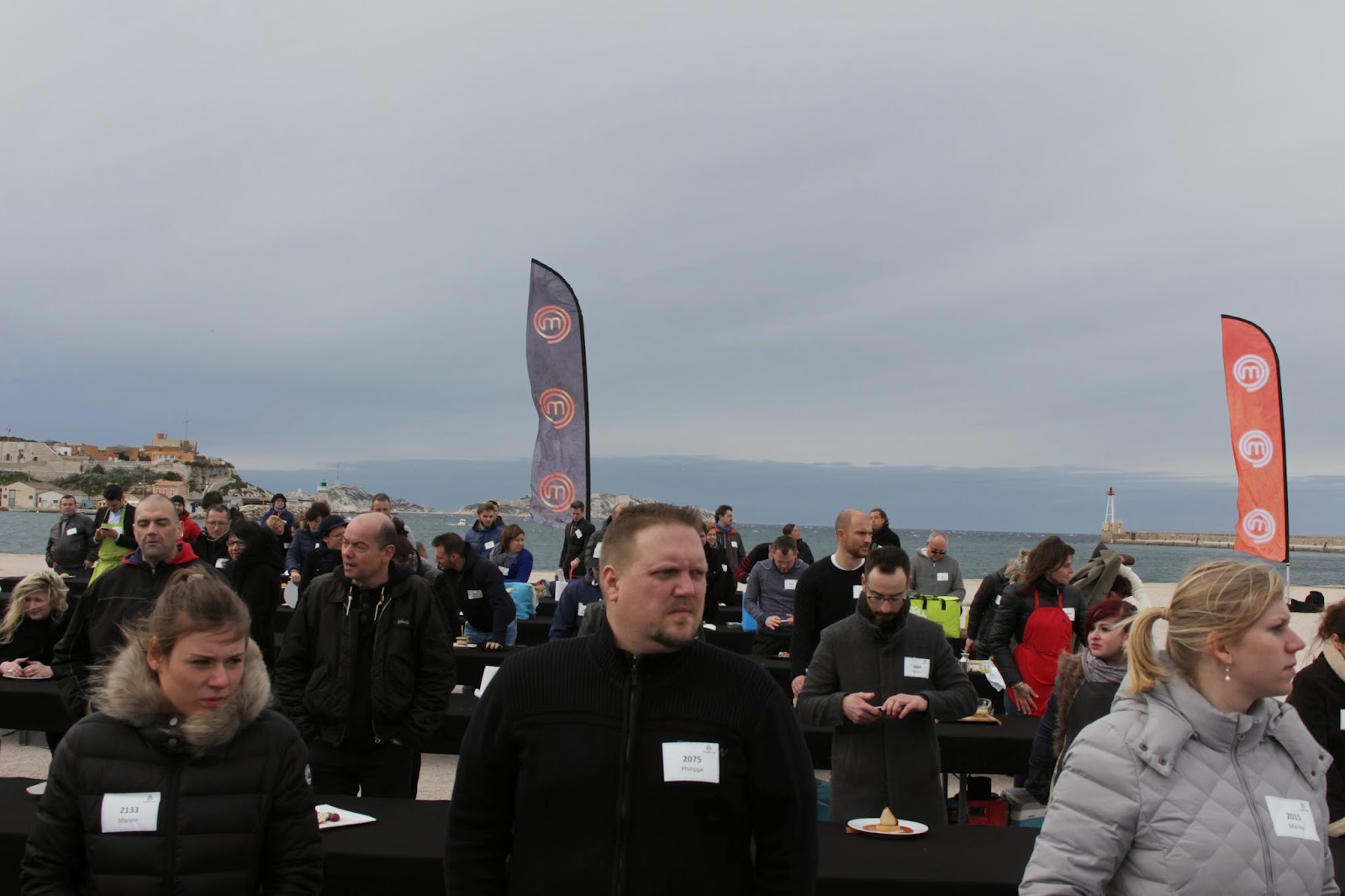 Un repas nous est distribué. Je me considère « chanceuse » dans le sens où j’ai pu manger un sandwich pas fameux pas trop tardivement car certains ont du attendre bien plus longtemps que moi. Je dois avouer que j’aurais préféré goûter mon plat ou ceux des autres (notamment, mon voisin de gauche qui avait réalisé un foie gras façon opéra de toute beauté). Cependant, nous étions trop occupés à protéger nos assiettes. Les candidats de la première rangée se mettent sous leur table qui est recouverte d’un tissu leur permettant de s’abriter. Les 9 autres tables, nous attendons jusqu’à environ 14h que les goûteurs ainsi que le chef passent dans les rangs et viennent goûter nos plats défraîchis par le climat de la citée phocéenne.