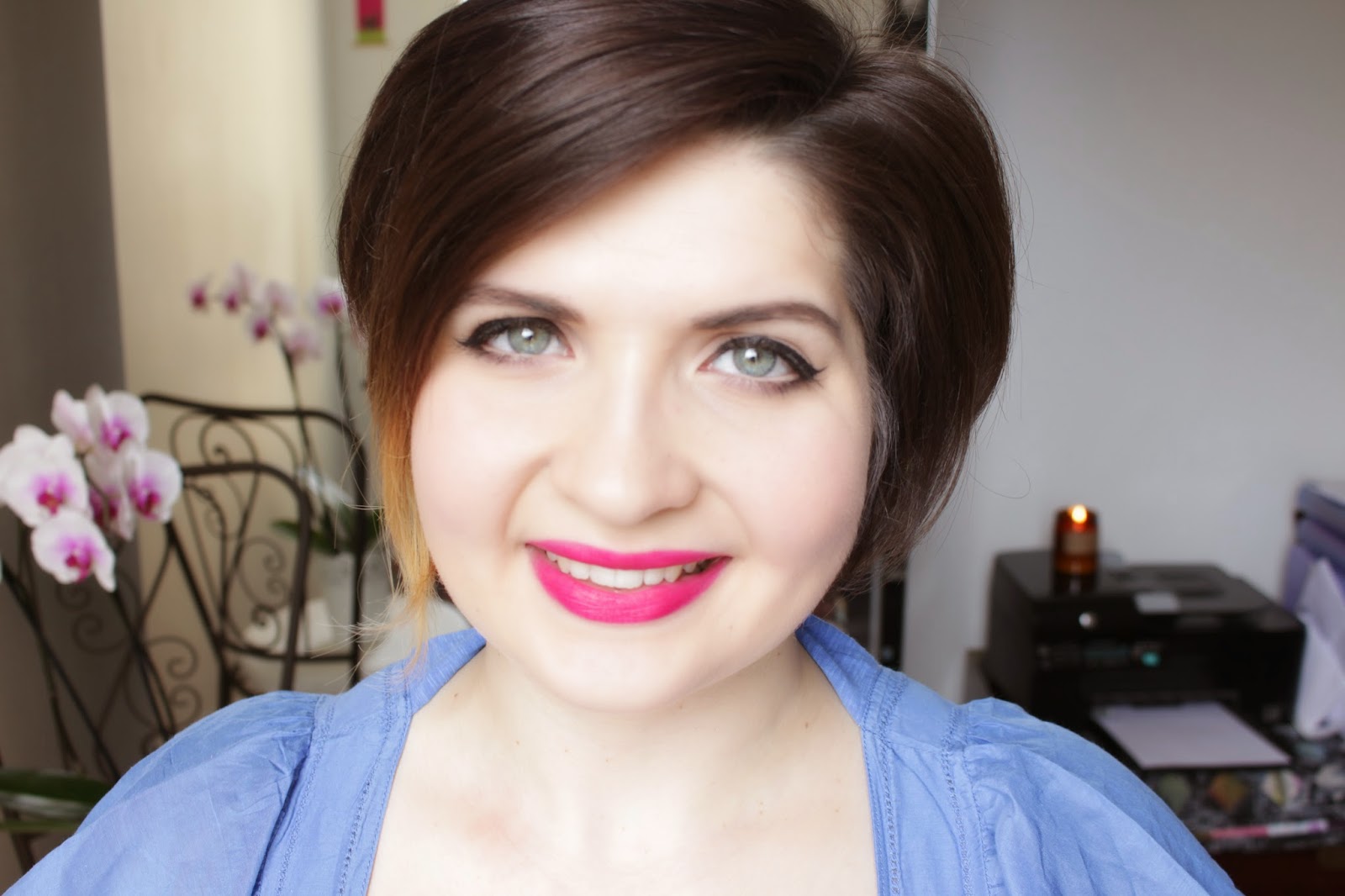 Black eyeliner and matte pink lips for a glamorous look.