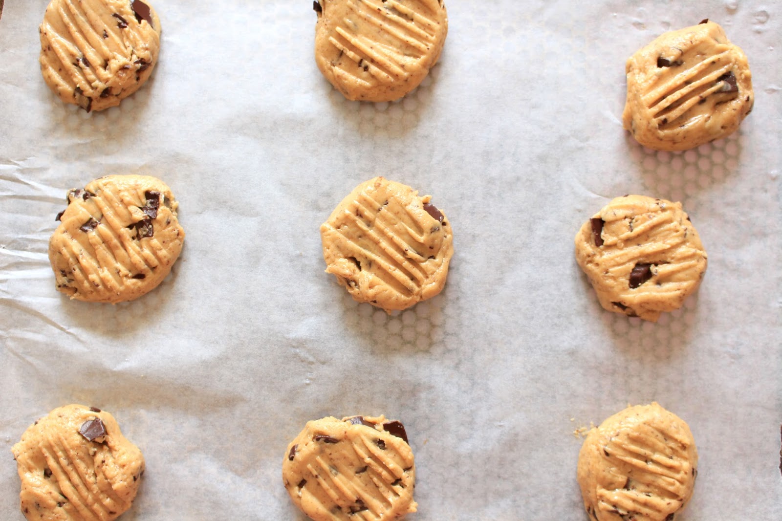 Take a spoon of dough and form it into a golf ball. Place them on a silicone mat or baking paper, press down with the back of a fork and bake for 10-12 minutes.