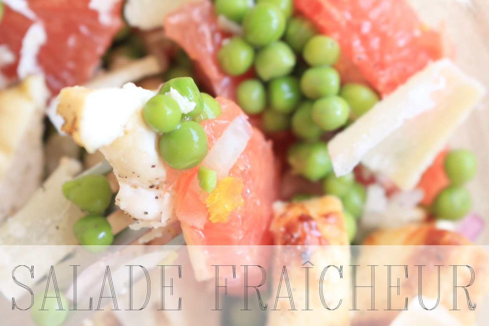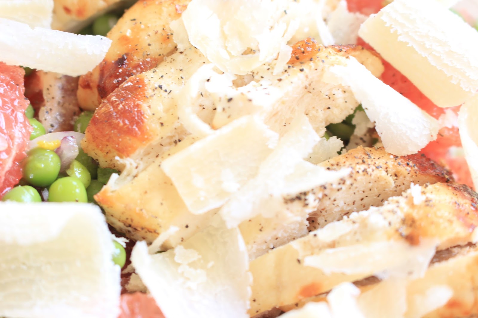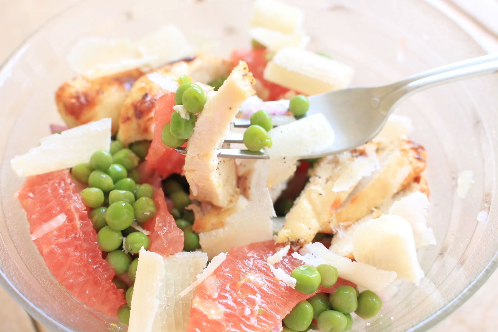 Compose the salad by mixing peas, onion and grapefruit. Add the chicken cut into thin pieces. Sprinkle with some parmesan.