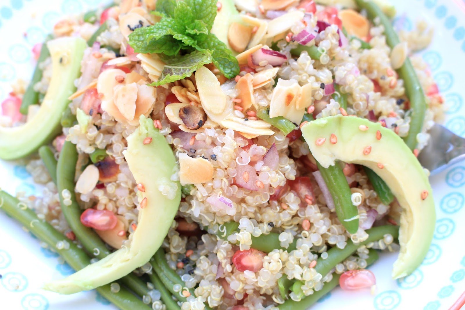 In a large bowl, add the quinoa, onion, green beans and pomegranate. Mix. Add the avocado cut in slices.