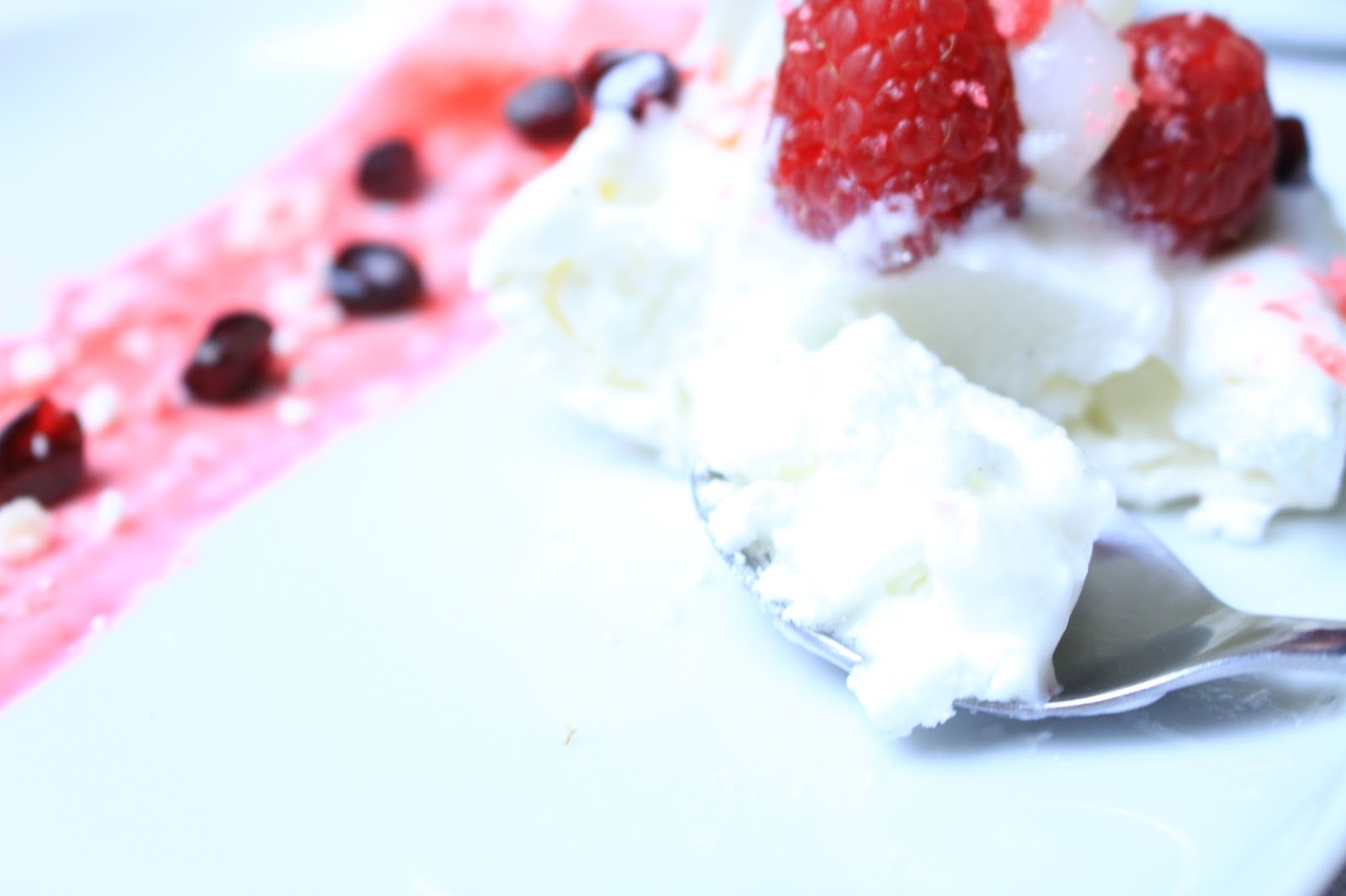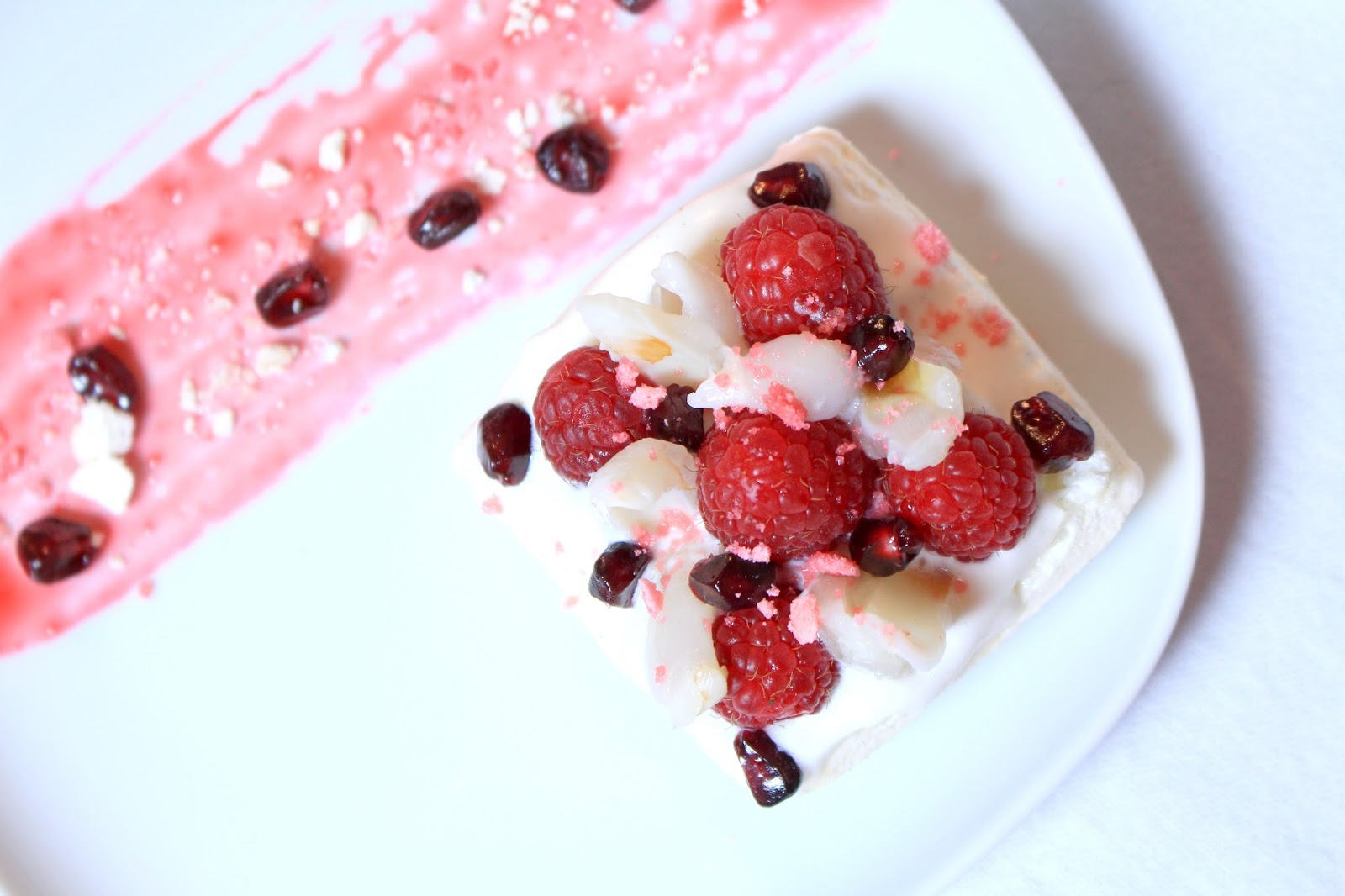 I made a raspberry sauce by simply mixing some frozen raspberries (left a bit outside the freezer to let them warm up) with a few drops of lemon. I spent the mixture into a sieve to remove seeds.