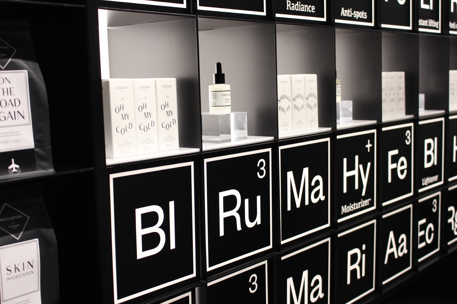 Comme son nom l’indique, Codage va coder mais surtout décoder les peaux et beautés de chacune afin d’ajuster au plus près le diagnostique de soins et les produits qui conviendraient le mieux à votre profil. D’ailleurs, le look de la marque n’est pas sans rappeler le tableau de Mendeleïev.