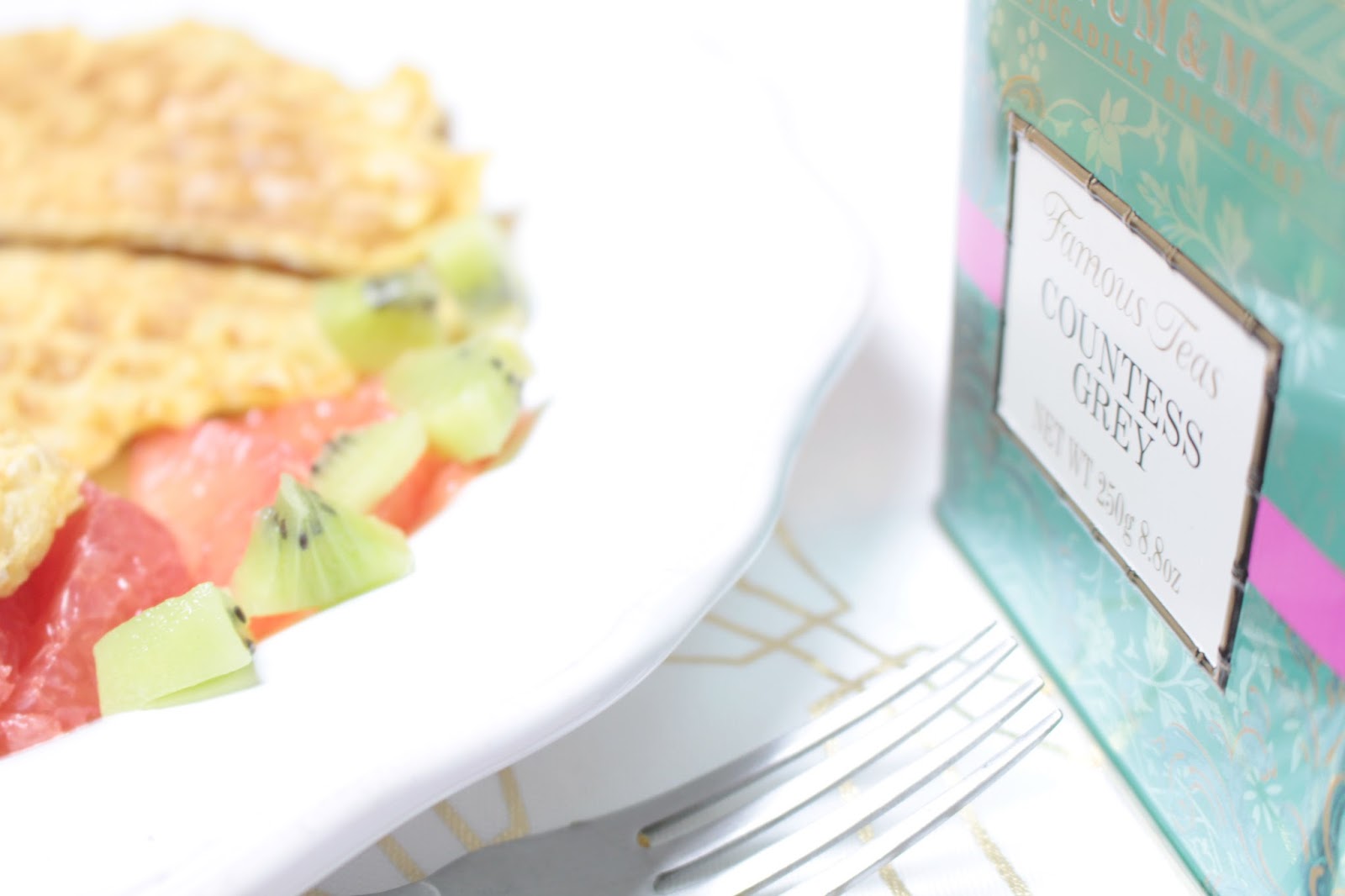 Serve the waffles with maple syrup and fresh fruits (here, kiwi and grapefruit).