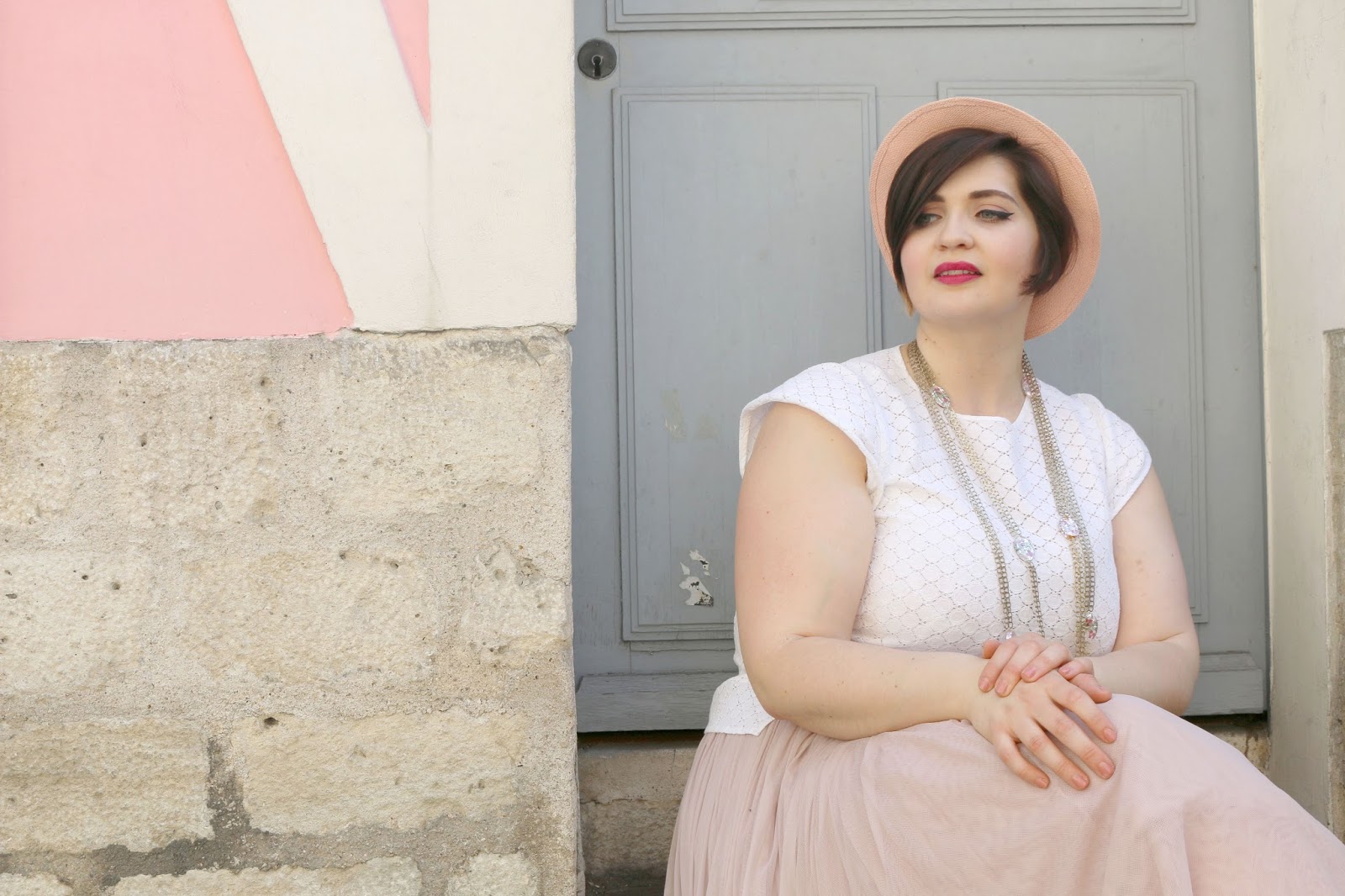Au niveau des accessoires, deux sautoirs en côte de mailles avec des perles en Murano avec des incrustations colorées donnent une symbiose à l’ensemble sans alourdir la tenue. J’en suis définitivement fan. Pour casser un peu le côté ultra romantique de cette tenue, un panama amène modernité et un effet un peu plus rock à la tenue.