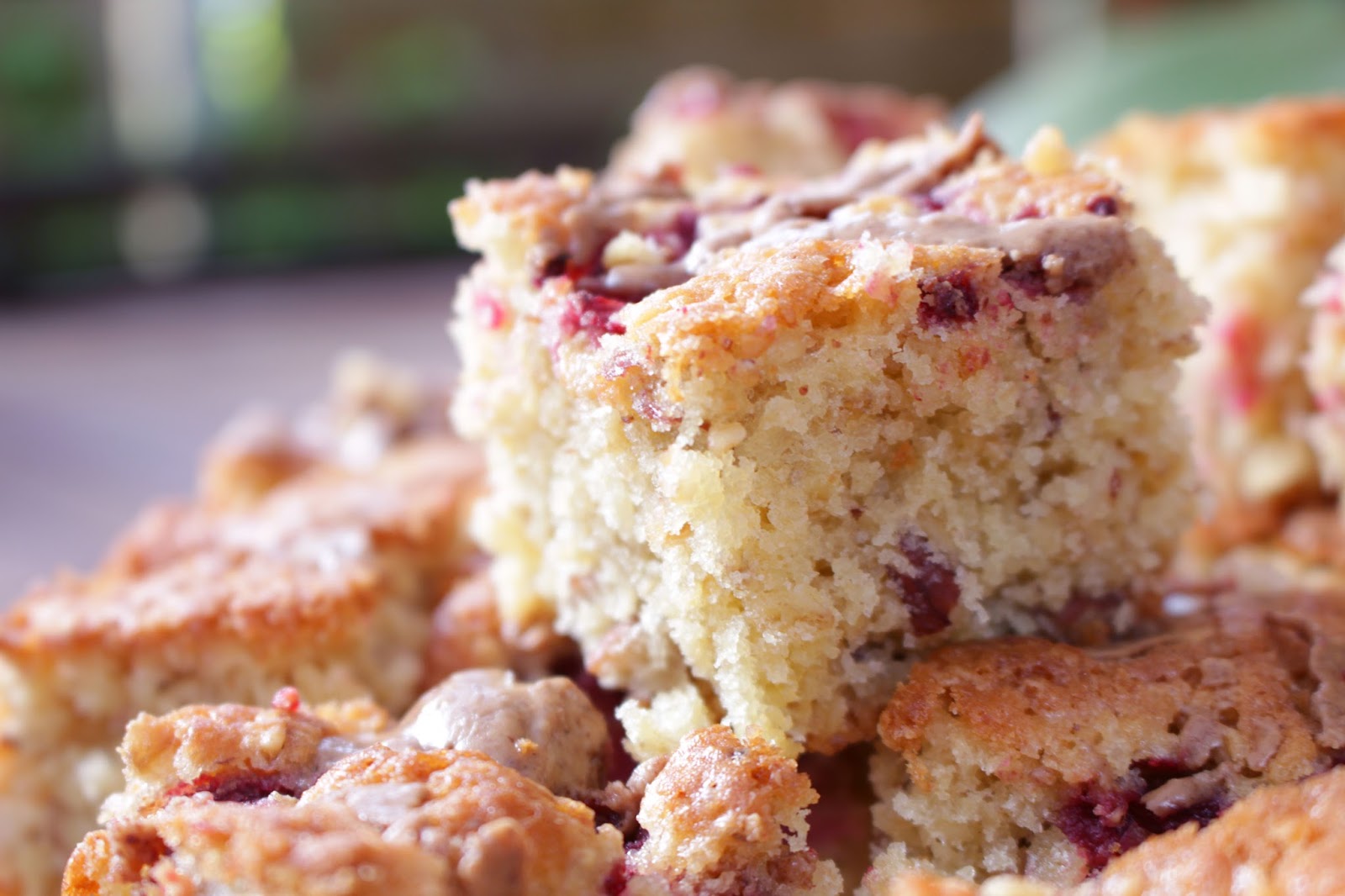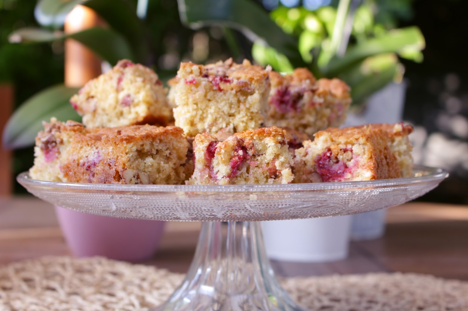 Pour this batter in a large loaf pan covered with baking paper and sprinkle the raspberries and almond butter.