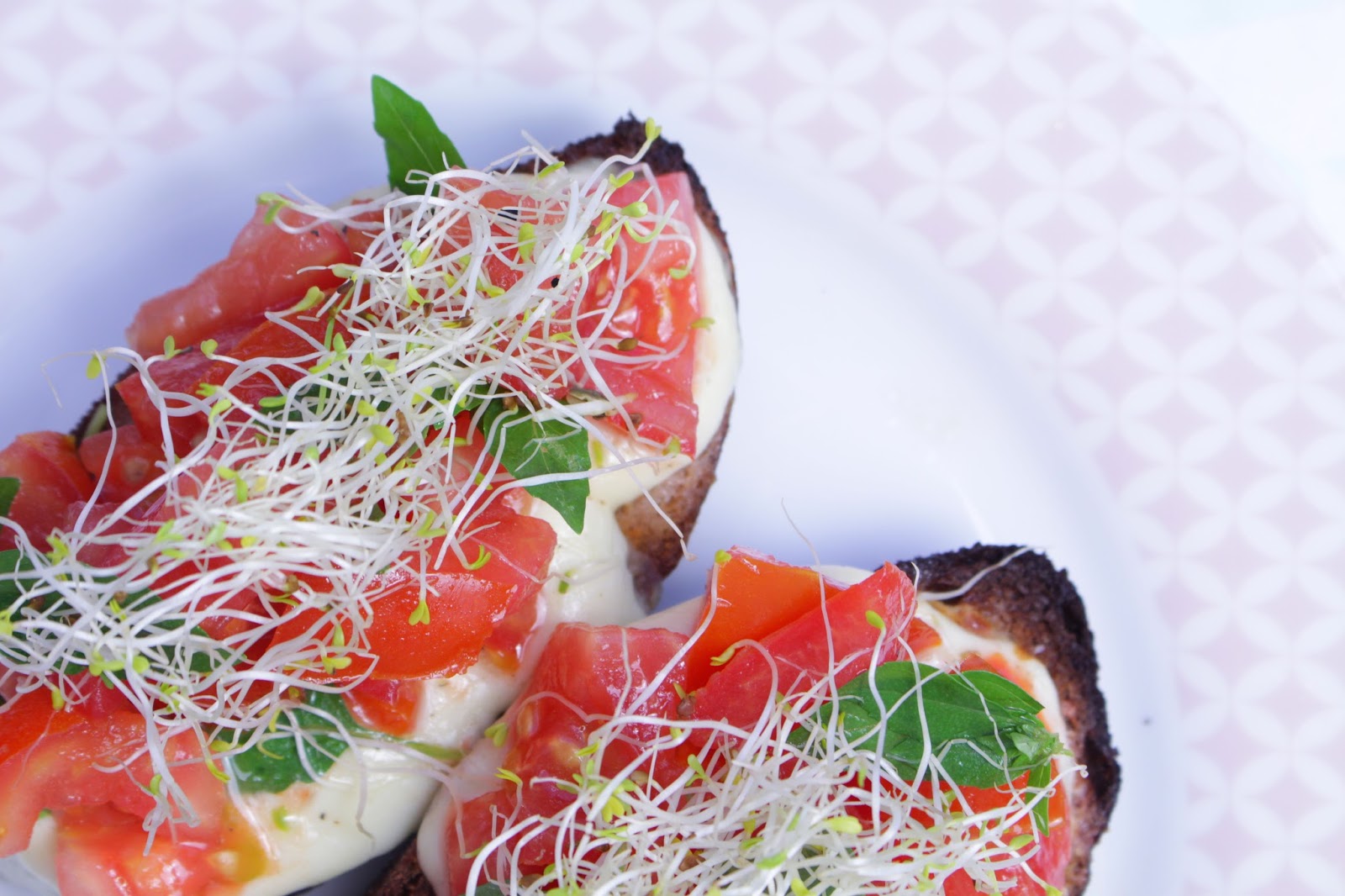 Sortir les tartines du four. Les disposer dans une assiette et y ajouter les tomates.