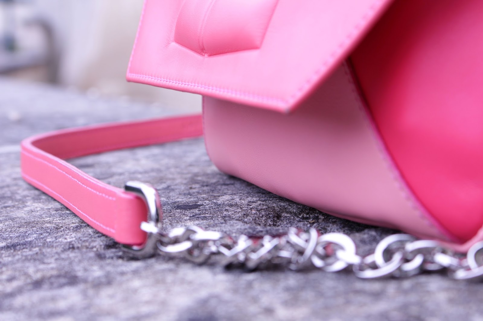 A thin silver chain composed the handle and a piece of leather for the comfort of the shoulder. This bag is made out of smooth leather and has several geometric cuts of leather in différent shades of pink. I love this mix of colors that immediately brighten up an outfit! It’s fresh, summery and especially unique. I had nothing that looked to this model.
