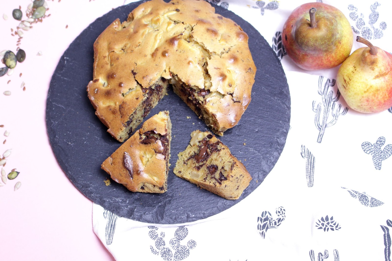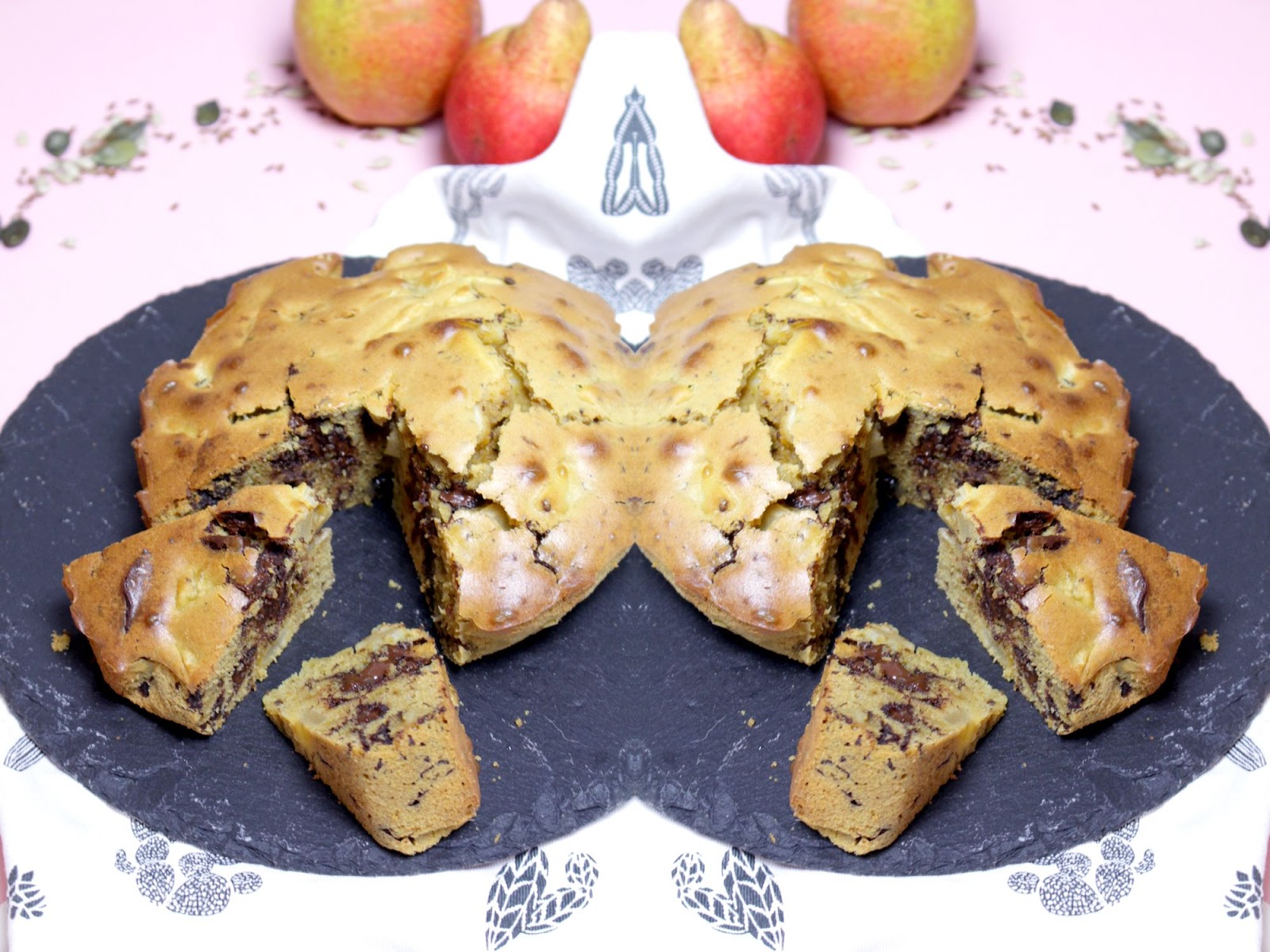 Wash, peel, remove seeds and cut the pear and coarsely chop the dark chocolate. Pour all in the preparation.
