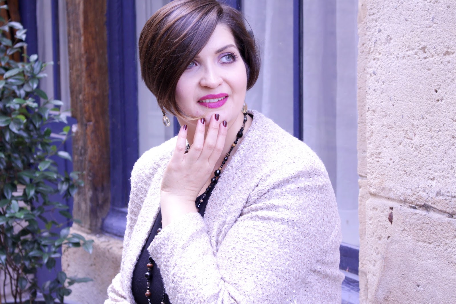 Niveau accessoires, les bijoux OGGI se veulent légers. La robe s’habille d’un long collier « cravate », c’est à dire que l’on noue à la hauteur que l’on souhaite. Ce collier est vraiment superbe et suit les moindres mouvements de la robe. Ses couleurs noires et marrons donnent profondeur et texture au vêtement. Avec les boucles d’oreille, nous jouons du doré mais aussi de la transparence pour renforcer le côté lumineux que la veste apporte à la tenue. Des gouttes toute en simplicité complètent l’ensemble et se mélange parfaitement aux cheveux avec les reflets ocres du bijou.