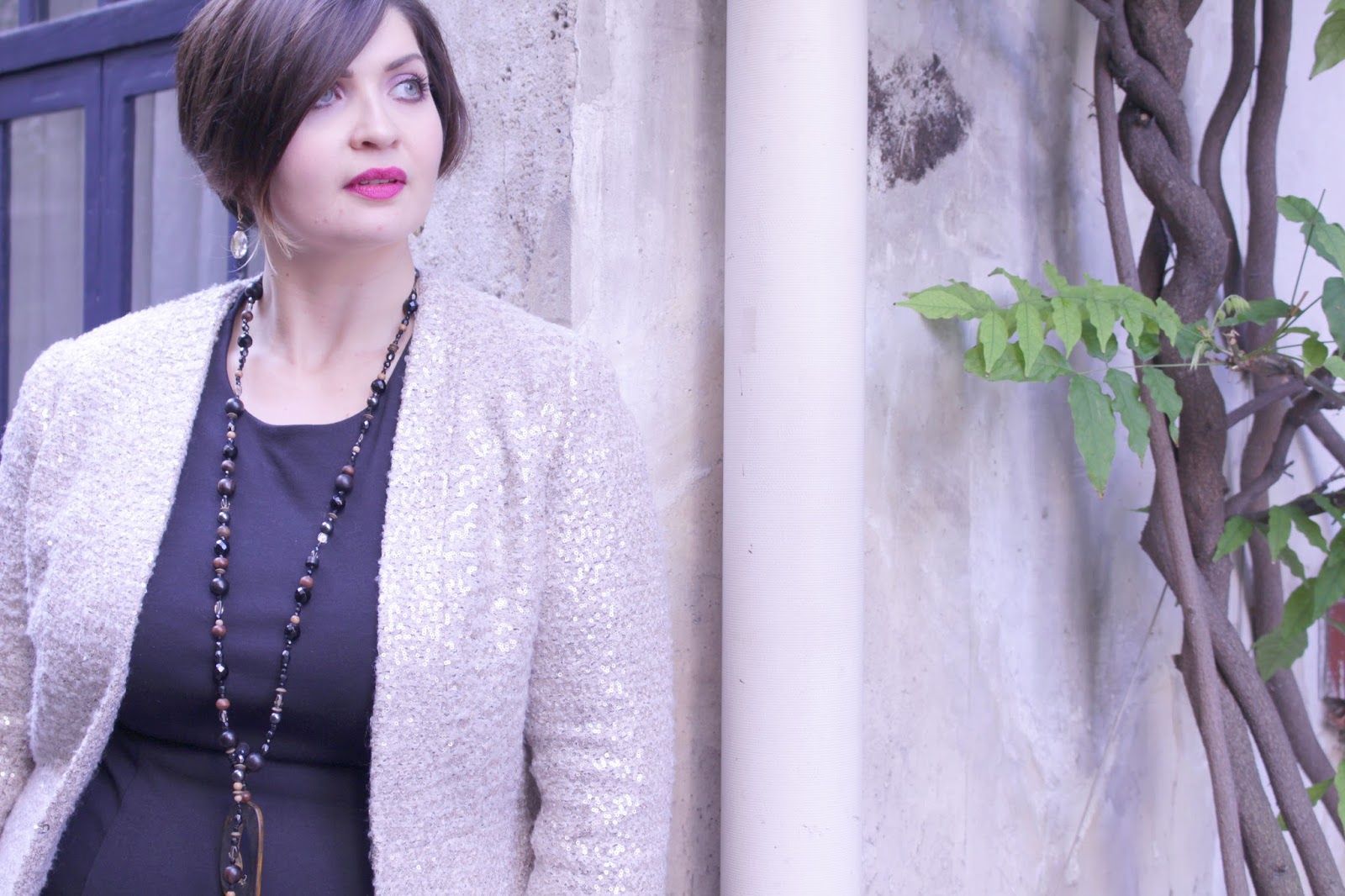 Pour une version automnale de cette pièce qu’est la Petite Robe Noire, je l’ai combiné avec une veste cintré brodée de paillettes dorées, des collants plumetis et des derbies pour ajouter une touche « preppy ». J’ai également ressorti mon manteau d’hiver à l’inspiration militaire avec ses rangées de boutons symétriques.