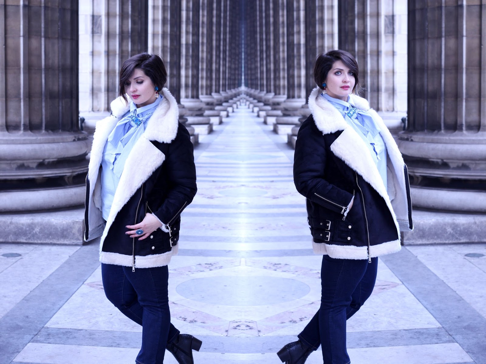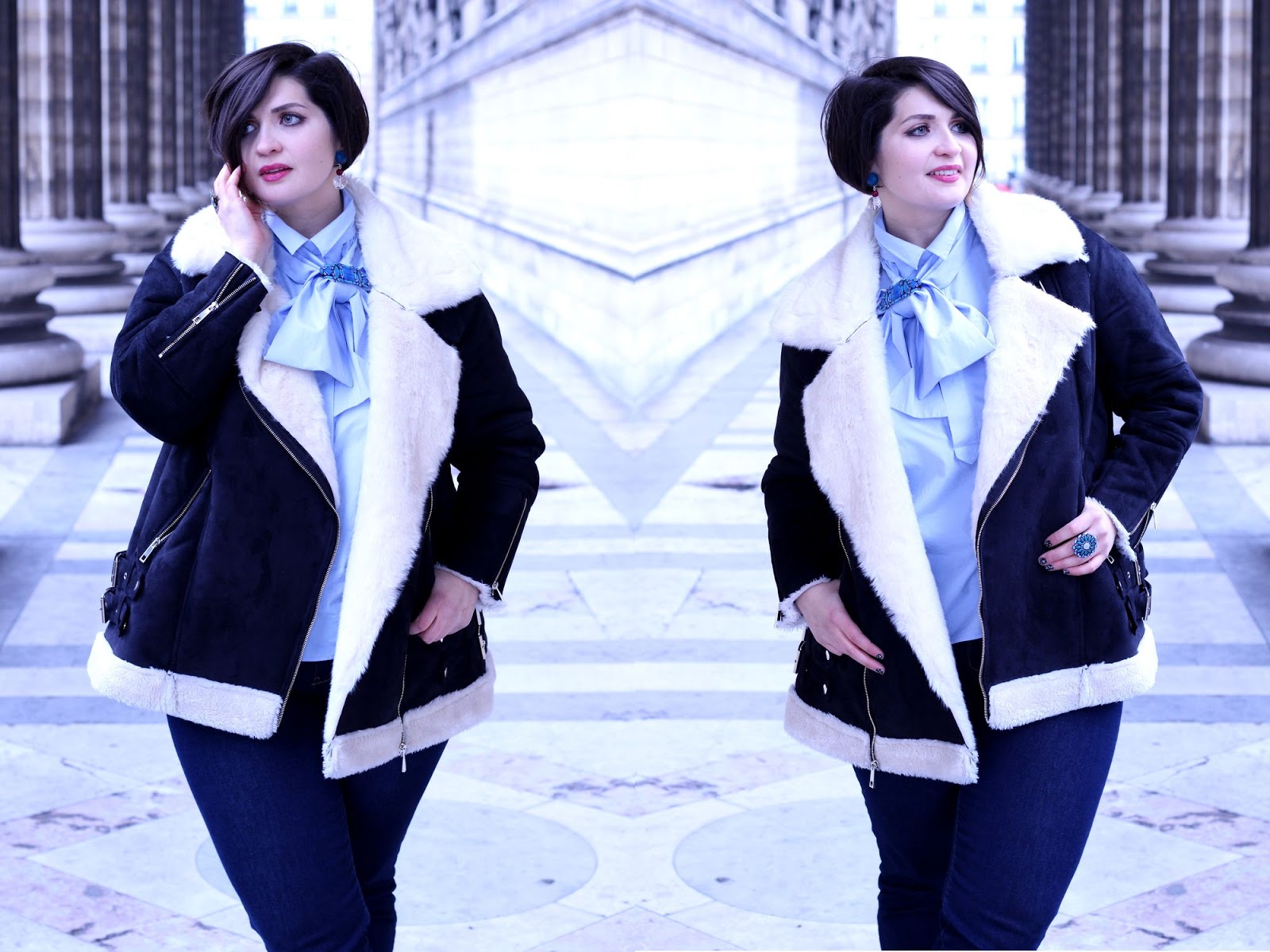 Pour l’effet rock, j’ai fait le choix de bottines noires avec un look très reptilien et un blouson aviateur en (fausse) peau de mouton retournée. C’est la pièce ultra chaude et cosy dans laquelle j’adore me blottir.