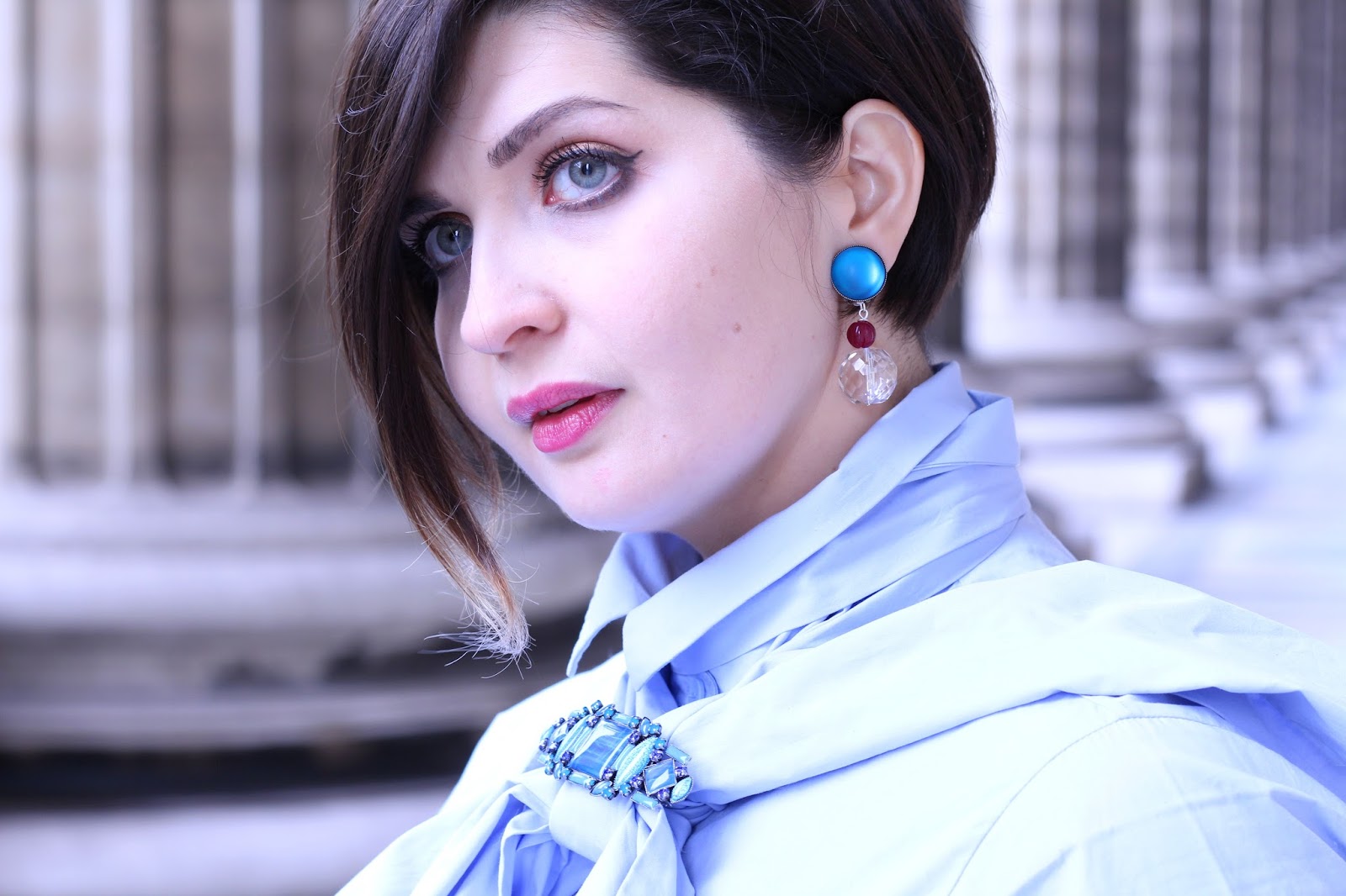 With OGGI, we chose to add a touch of fairytale with a blue spectrum worked through Murano: blue lavender, blue duck, etc. Which we find on the ring and the brooch that we slipped at the knot of the shirt. As for the earrings, we also find a hint of blue, red and above all transparency. The jewel with these three steps highlights the three structures of the shirt: the collar, the knot and the fallen.