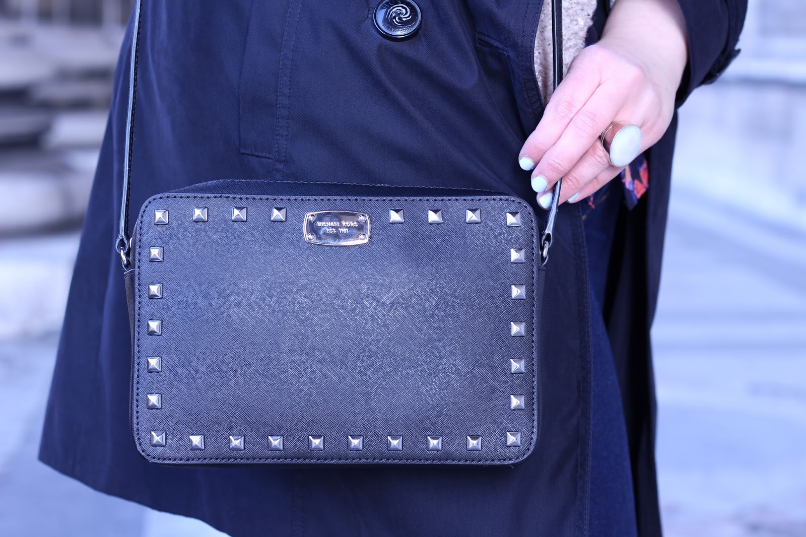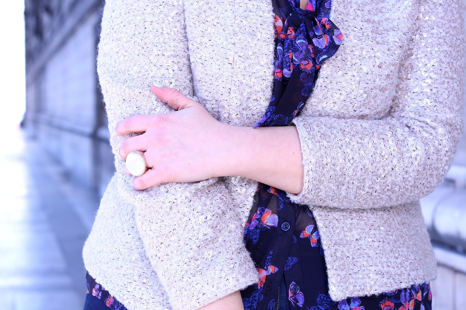 Pour ce look, j’avais très envie de porter mes ballerines chéries. En plus, le rouge perce le camaïeu de gris si typique de Paris. Pour les accompagner, un jean 7/8 brut qui découvre délicatement la cheville – j’adore! Un chemisier lavalière transparent avec plein de papillons pour emporter partout le printemps avec moi. Ma veste à paillette dorée amène cette touche de lumière essentielle et puis, j’ai terminé avec un trench.