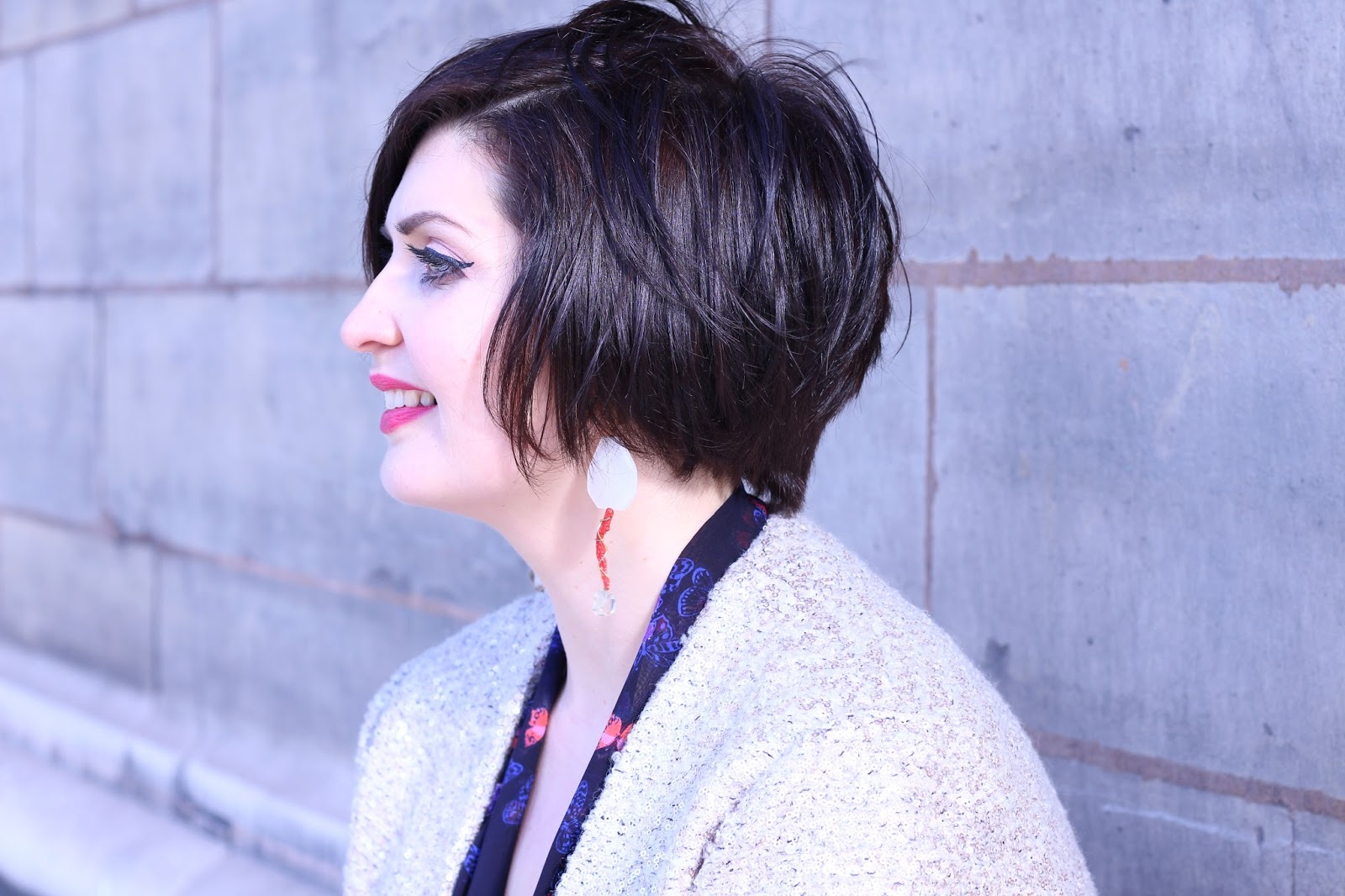 As for the jewelry, we are also on a balance between color and light with these new creations of OGGI. To recall the colors of the blouse, we selected a pair of earrings with white quartz, crystal and coral. I find them perfect for spring because they twirl with every movement. These earrings bring lightness and depth to the outfit.
