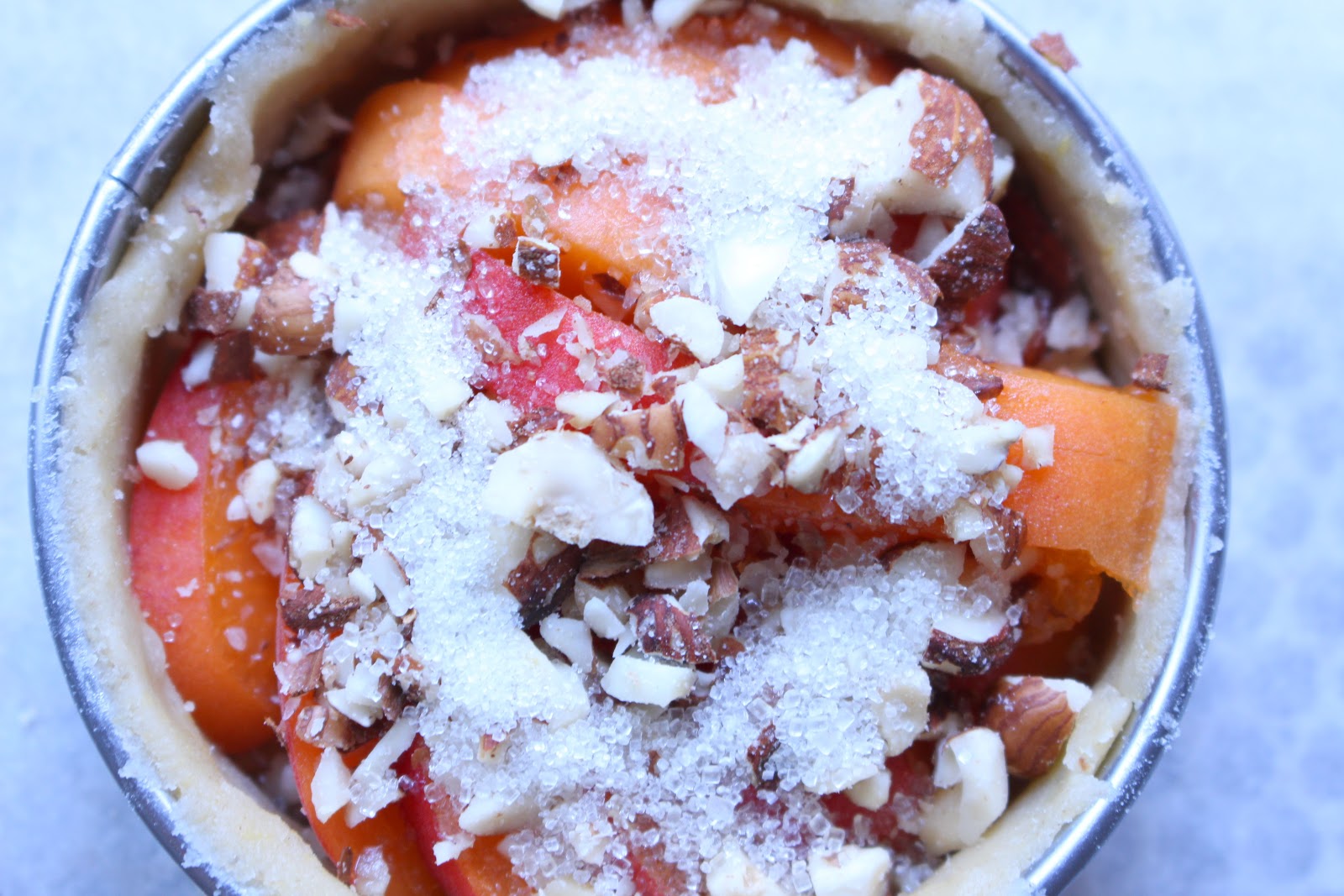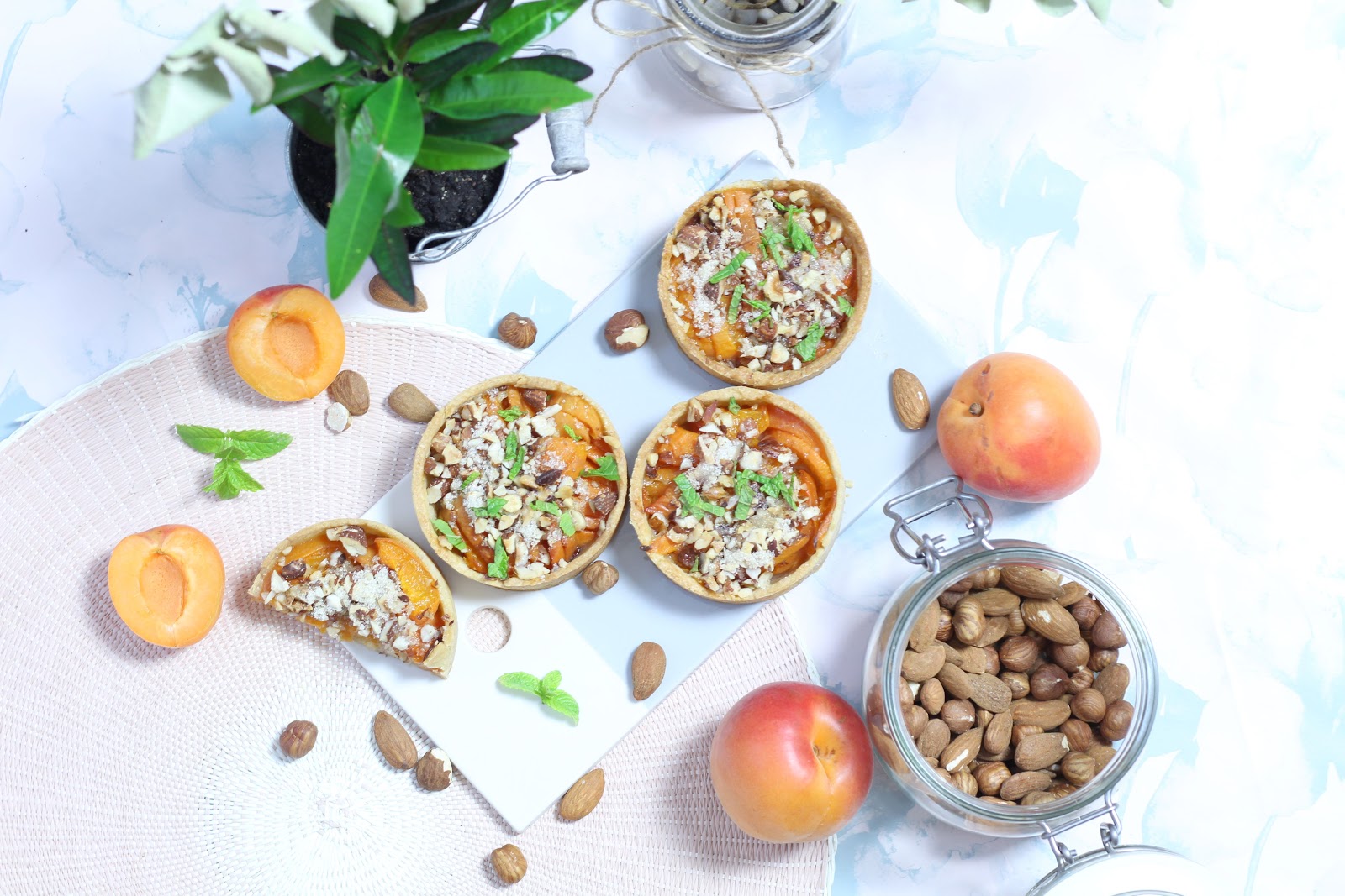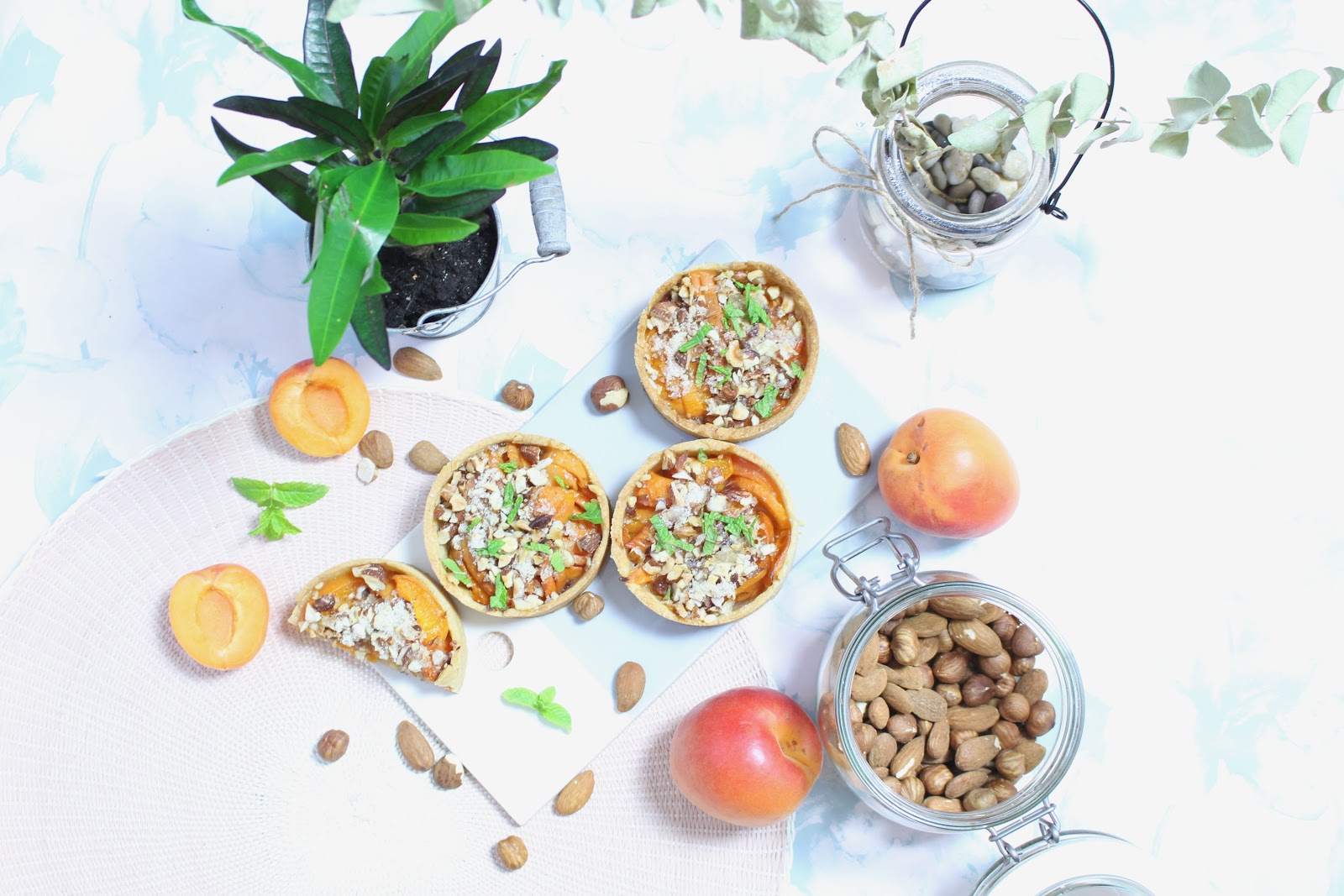 Wash, pit apricots and cut thin strips. Place the fruit in the tarts. Sprinkle with almond/hazelnut powder, a little sugar and a dab of butter.
