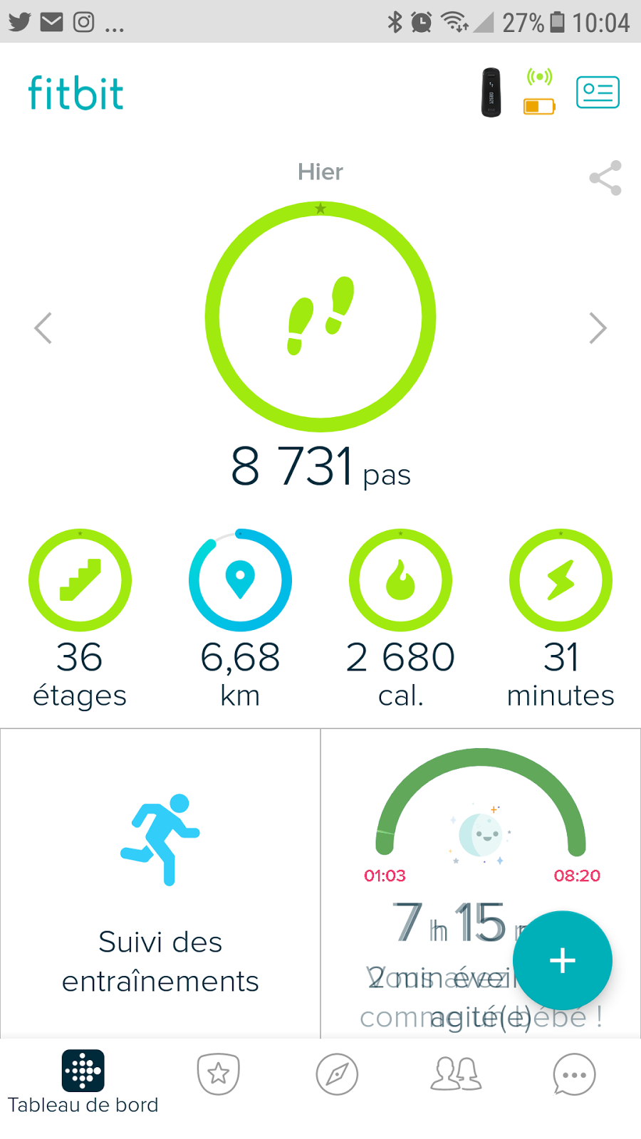 Ce qui m’a vraiment intéressé dans le Fitbit est l’analyse du sommeil. Même si je sais que je ne dors pas assez (merci la double vie de psy/blogueuse!), je voulais en savoir plus sur la qualité de mon sommeil. Cela permet de mieux comprendre mon rythme, l’état dans lequel je me réveille, etc. Le challenge serait d’arriver à dormir chaque nuit les 7h que je me suis fixée…Il y a encore du travail pour se faire!